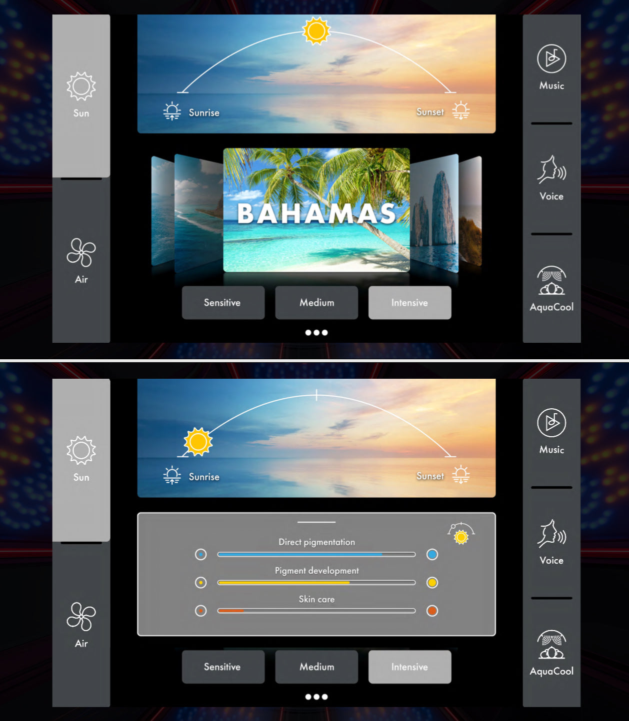 - AquaCool – Refresh yourself with a revitalising mist during your tanning session. You can adjust the intensity of the AquaCool mist to your liking, with the option to release a burst of spray at any time for an extra refreshing experience.