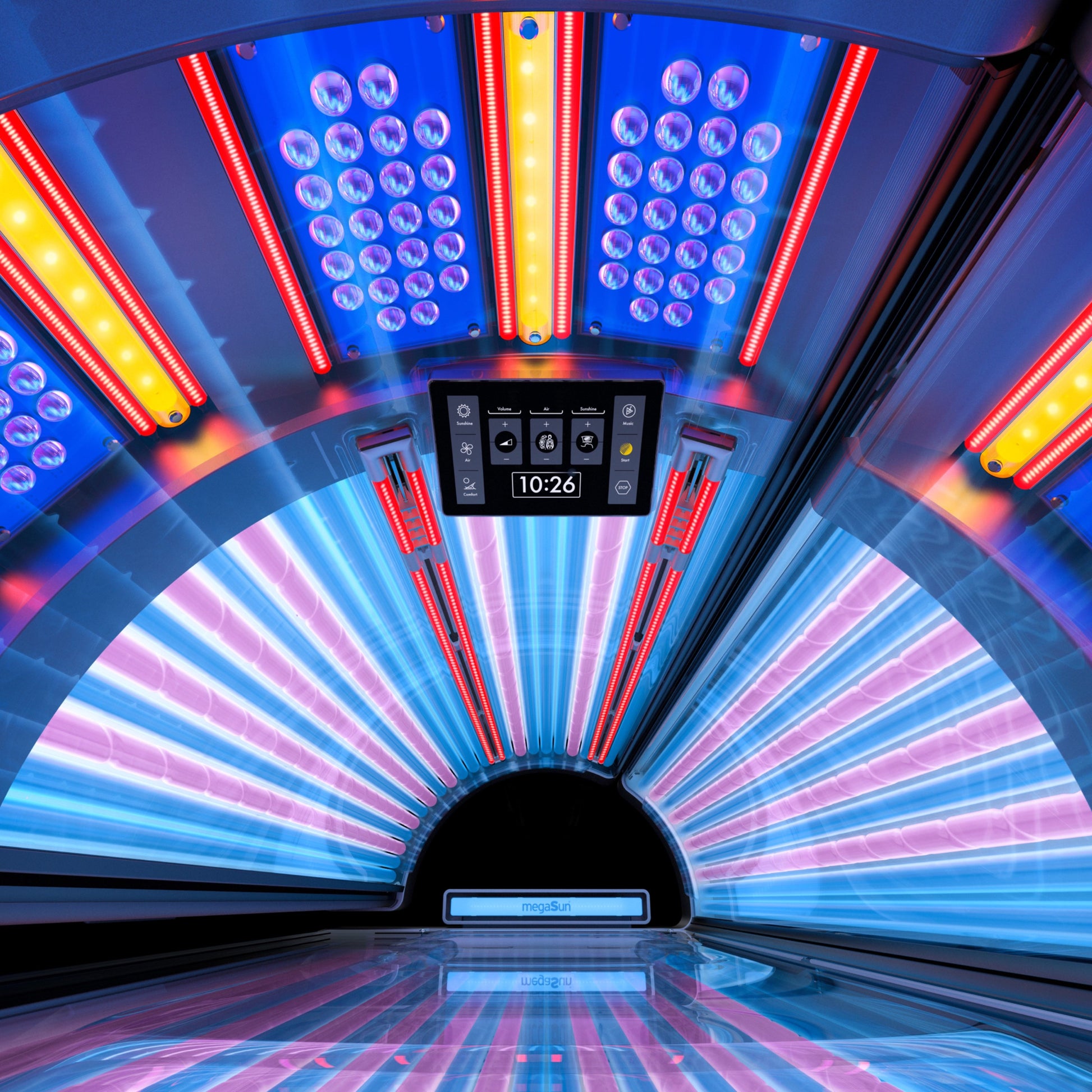 With the success of the P9S, LED technology established itself in the solarium sector. This quantum leap in terms of spectral technology is now available in the K6S and K7S. High-performance LEDs only produce the wavelengths required for a beautiful and gentle tan. At the same time, aspherical lenses in front of the LEDs guarantee an absolutely uniform illumination of the face and décolleté. Progress that can be experienced immediately.