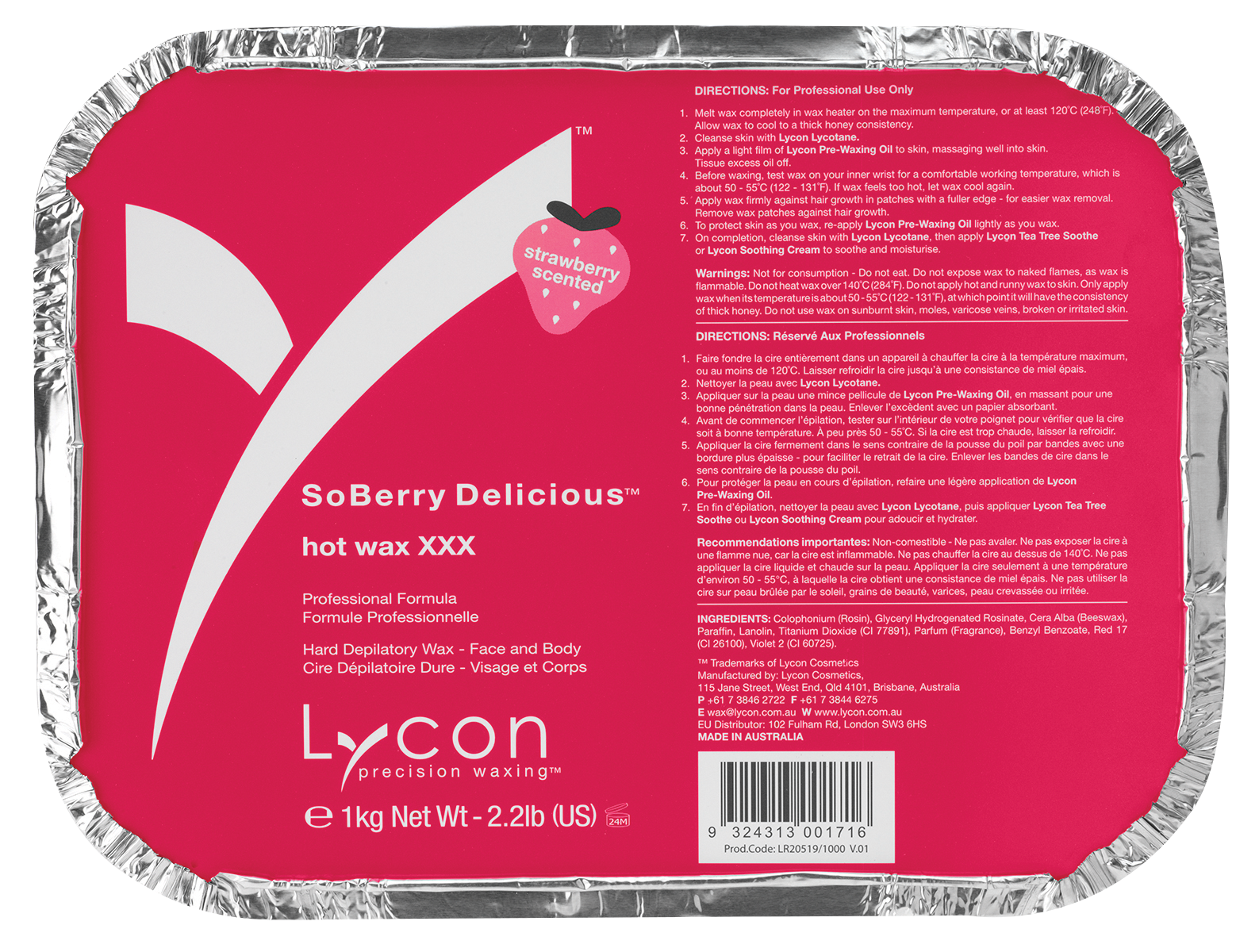 Vibrant pink, super creamy and flexible with a strawberry scent that smells good enough to eat! Contains LYCON’s unique Titanium Dioxide technology and is extra gentle for sensitive areas. Perfect for Brazilian waxing!